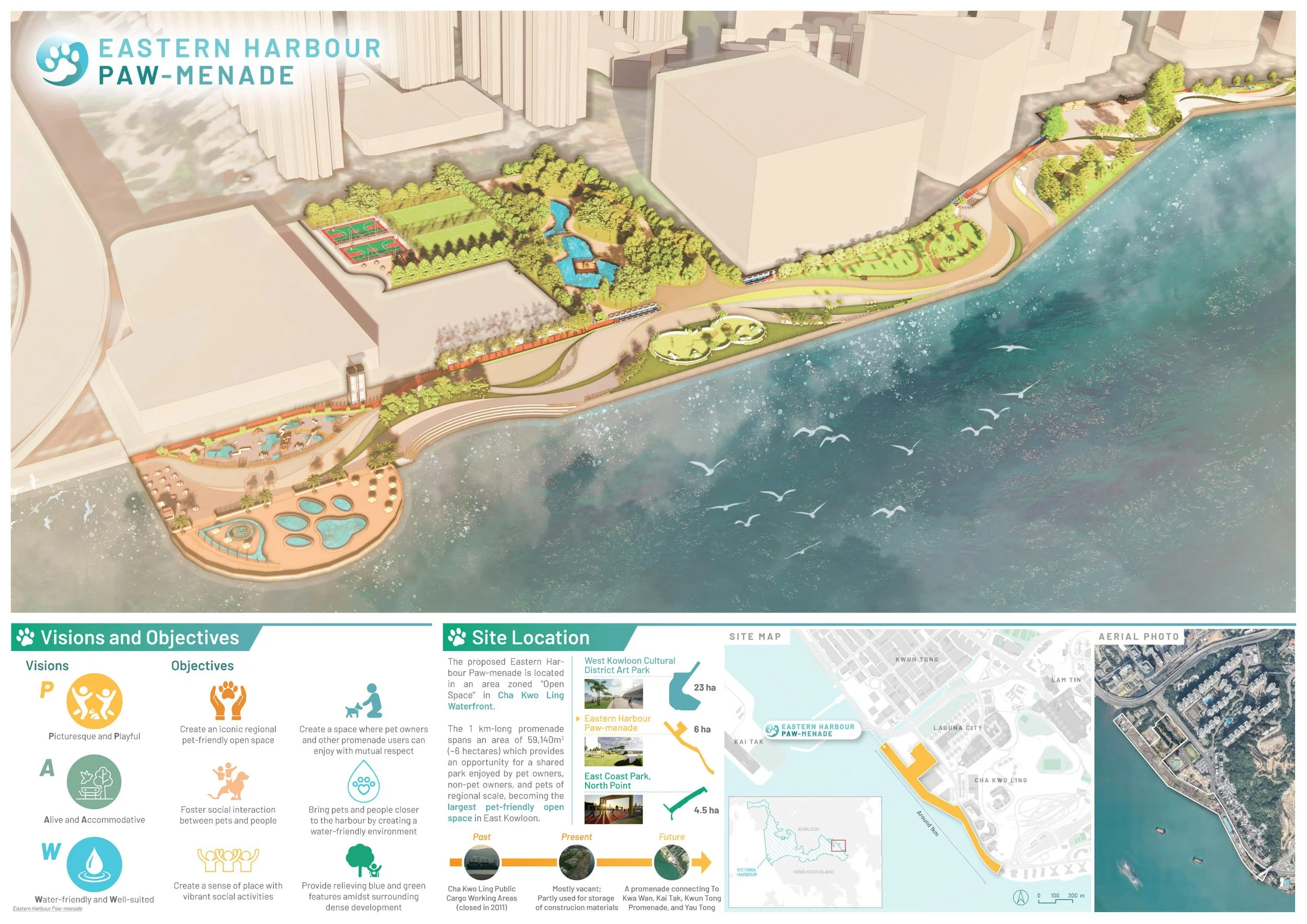 The 6-hectare Eastern Harbour Paw-menade is envisioned to create a Picturesque and Playful, Alive and Accommodative, and Water-friendly and Well-situated iconic regional open space that will cater all types of household pets, age groups and users from all parts of Hong Kong. The pet-friendly and age-friendly Paw-menade will synergise with future development. As parts of the site are under planning by Drainage Services Deparment (DSD) and Vocational Training Council (VTC) with their concurrent projects respectively, the Team has explored the possibilities to incorporate pet-friendly elements into the promenade and proposed a Master Layout Plan that is compatible to DSD and VTC’s projects.